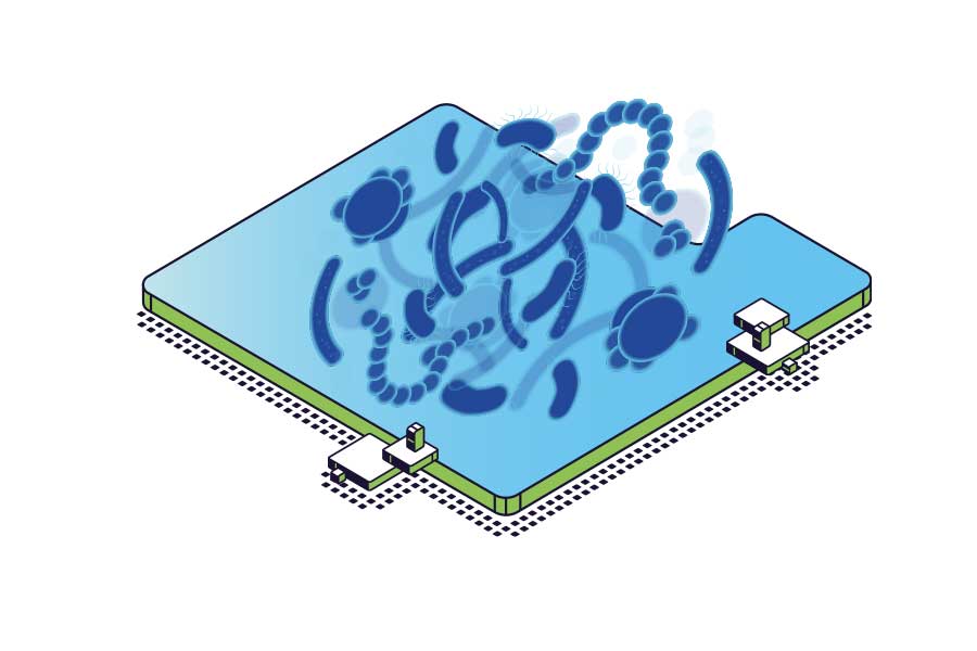 Kühlturm-Tropfenabscheider gehören zu den wasserbenetzten Oberflächen, die besonders anfällig für Biofilmbildung sind. Günstige Voraussetzungen für das Wachstum dieser schleimigen Mikroorganismenschicht sind raue Oberflächen, Korrosionsprodukte, mineralische Ablagerungen, Schlamm und Schmutz. Tropfenabscheider aus